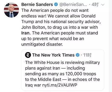 美國(guó)人不喜歡無(wú)休無(wú)止的戰(zhàn)爭(zhēng),我們不能讓特朗普和他的國(guó)安顧問(wèn)博爾頓,將我們拖入一場(chǎng)與伊朗的戰(zhàn)爭(zhēng)。美國(guó)人民必須站起來(lái)阻止這場(chǎng)徹頭徹尾的災(zāi)難!
