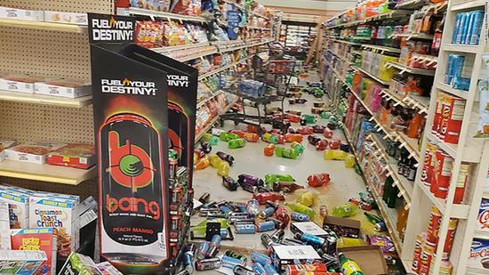 據(jù)美國地質調查局地震信息網(wǎng)消息,本次地震發(fā)生于當?shù)貢r間4日上午10時33分(北京時間5日1時33分),震中位于瑟爾斯谷西南12公里處,震源深度10.7公里。距離震中約270公里的洛杉磯和周邊城市有明顯震感,當?shù)胤课輷u晃了10秒鐘左右。此次地震造成部分店鋪的商品從貨架倒塌,從現(xiàn)場圖看,不少飲料灑落一地。