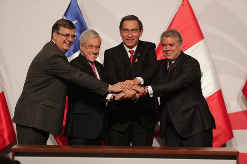 《利馬聲明》指出,太平洋聯(lián)盟將進(jìn)一步擴(kuò)大成員國(guó)之間的貿(mào)易,繼續(xù)推進(jìn)自由貿(mào)易,推動(dòng)地區(qū)經(jīng)濟(jì)增長(zhǎng)和可持續(xù)發(fā)展。太平洋聯(lián)盟作為拉美地區(qū)一個(gè)主要貿(mào)易一體化平臺(tái),將建立同亞太經(jīng)合組織的協(xié)商機(jī)制,加強(qiáng)同其他區(qū)域性組織的貿(mào)易合作。秘魯總統(tǒng)比斯卡拉、智利總統(tǒng)皮涅拉、哥倫比亞總統(tǒng)杜克和墨西哥外長(zhǎng)埃布拉德分別代表本國(guó)在聲明上簽字。