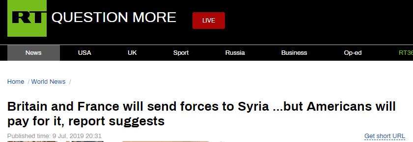 RT說(shuō),德國(guó)8日以國(guó)家政策為由拒絕增派地面部隊(duì),但《外交政策》的一份新報(bào)告稱,英國(guó)與法國(guó)愿意響應(yīng)華盛頓的呼吁。報(bào)道稱,英法兩國(guó)在敘利亞都駐有一定數(shù)量的地面部隊(duì),并將承諾增派10%至15%的兵力,以使美國(guó)撤軍。