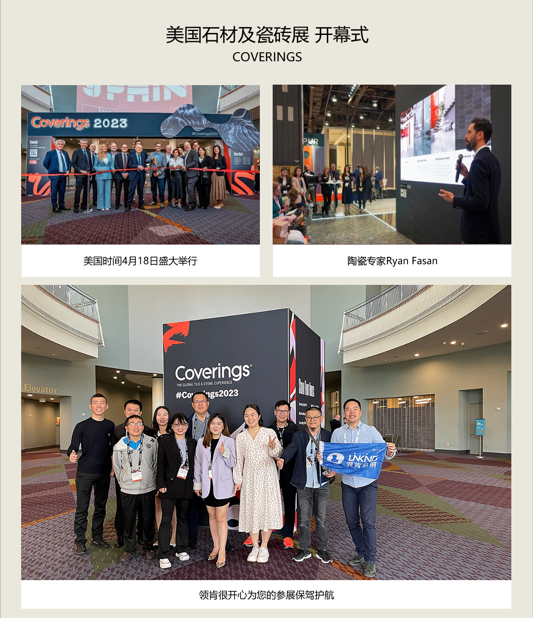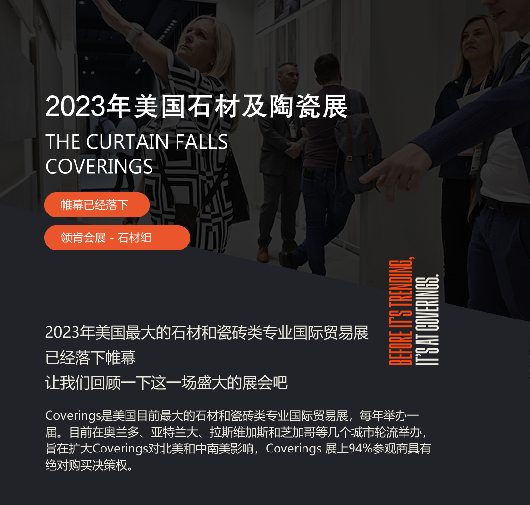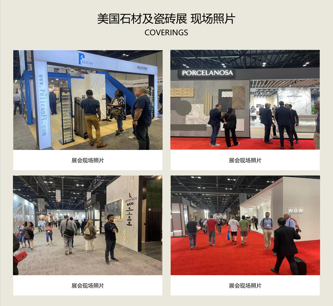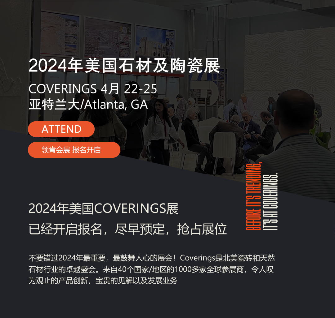 2023年美國(guó)石材及陶瓷展Coverings,有來(lái)自40個(gè)國(guó)家,約1000家參展商參與,與會(huì)觀眾超過(guò)20000名。來(lái)自中國(guó)的企業(yè)超過(guò)170家。