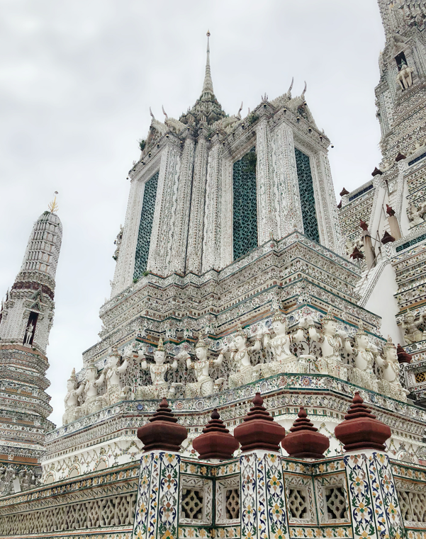 鄭王廟又叫黎明寺,規(guī)模僅次于大皇宮,其主殿和標志性的五座佛塔是大家最常游覽的景點。廟內(nèi)最著名的大佛塔,始建于1842年,屬于大乘舍利塔式,尖塔的外面裝飾以復雜的雕刻,并鑲嵌了各種彩色陶瓷片、玻璃和貝殼等,是泰國規(guī)模最大的一座大乘塔。