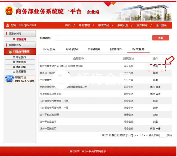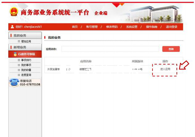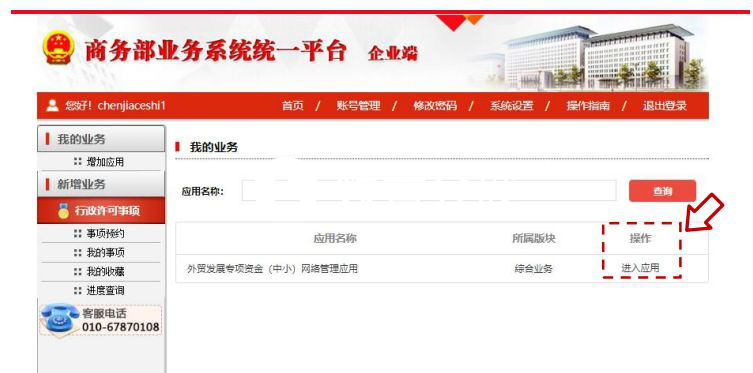 步驟4:中小企業(yè)用戶登錄成功后即可進(jìn)入個(gè)人業(yè)務(wù)大廳,選擇外貿(mào)發(fā)展專項(xiàng)資金(中?。┚W(wǎng)絡(luò)管理應(yīng)用后方的“進(jìn)入應(yīng)用”按鈕,進(jìn)入業(yè)務(wù)申報(bào)頁(yè)面。